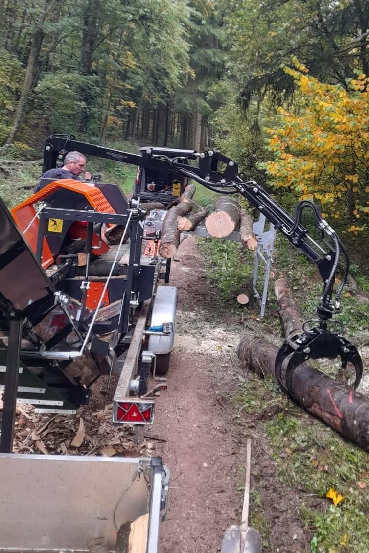 2025 wurde das Lohnspalten hinzugenommen. Wir sägen und spalten Baumstämme zu Hause oder direkt im Wald.